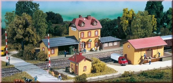 Skladiště 150 x 90 x 80 mm, Strážní domek 70 x 65 x 90 mm se zvonkovým zařízením. Mechanismus k ovládání závor a stožár elektrického venkovního vedení s atrapou svítidla. Železniční přejezd 150 x130 mm. Pilník pro modeláře.