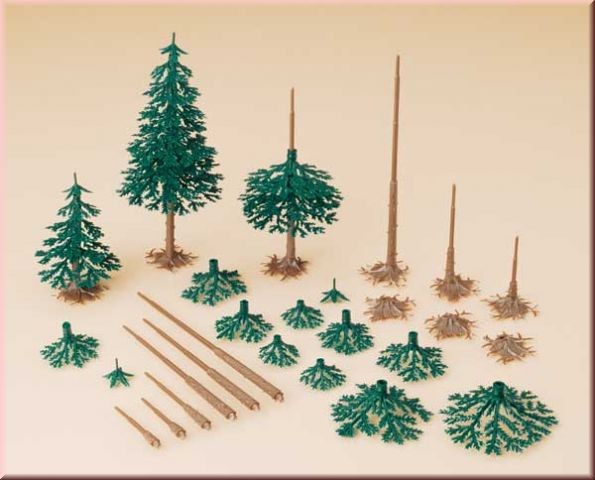 Bez vločkované úpravy, 4 různé velikosti. Jednotlivé věnce větví navlečte na kmeny stromů. Podle potřeby nalepte kořenové náběhy. Otáčením patky stromu lze docílit toho, aby stromy i na příkrých svazích stály zpříma.
