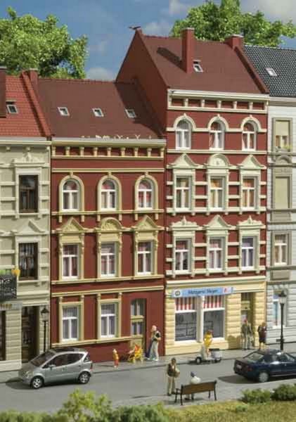 Třípatrová a čtyřpatrová budova s nebytovými prostory v přízemí. Vhodné k našim modelům Schmidtstraße 11 a 25. Přední, štítové a zadní strany jsou vytvořeny z cihel. Uliční průčelí se štukovými ozdobami.