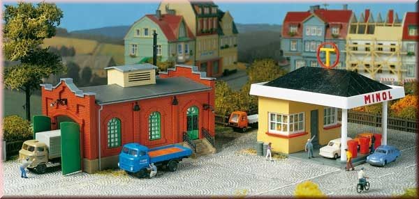 Budova této menší autoopravny pochází zhruba z roku 1890. Ve třicátých letech byla benzinová čerpadla nahrazena stavbou čerpací stanice. Křídla vrat lze ručně otevírat. Můžete si tady nechat opravit i svého trabanta! Model podle skutečnosti.