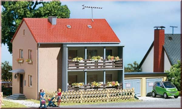 Podobné novostavby vyrůstaly v šedesátých letech v malých městech. S balkonem a přistavěnými garážemi. Model podle skutečnosti.