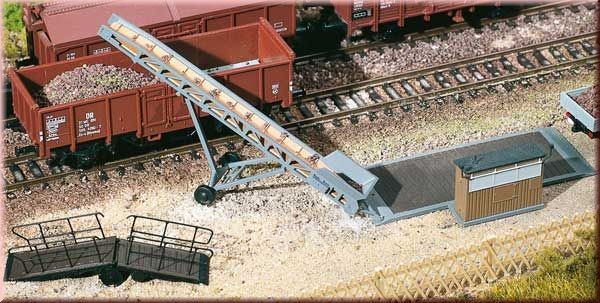 Tato třídílná sada bude obohacením vašeho kolejiště či dioramatu. Slouží k nakládání a vykládání sypkého materiálu. Pásový dopravník byl využíván v nakládacím prostoru v areálu nádraží, v zemědělských obchodních zařízeních či zemědělské výrobě. S možnosí nastavení výšky od 21 do 52 mm. Lze použít rovněž jako náklad pro plošinové vozy. K silniční váze patří jáma zakrytá dřevěnými fošnami. Nákladní vozidla, přívěsy a povozy musely před a po vyložení najet na váhu. Rozdíl hmotností sloužil k výpočtu množství sypkého materiálu. Pojízdná nakládací rampa byla využívána především k nakládání kusového zboží do krytých nákladních vozů nebo dobytka do železničních vozů určených k transportům zvířat. S možností nastavení výšky do 20 mm.