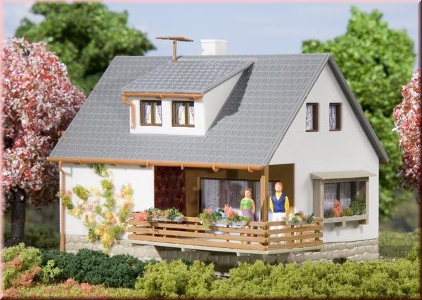 Účelný rodinný dům s balkonem a terasou. Vhodný k vytvoření satelitních městeček. S předsazeným oknem s květinovou výzdobou.