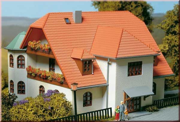 Dům pro dvě rodiny s velkými balkony, zajímavou arkýřovou přístavbou a garáží. Dům může být postaven na svahu i rovném pozemku. Potřebné díly jsou součástí stavebnice.