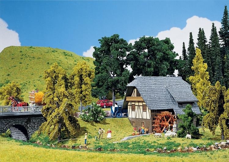 Stavebnice modelu menšího domu se šindelovou střechou a mlýnským kolem.