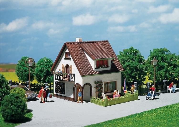 Stavebnice modelu domku s vikýři, balkonem a zajímavým vchodem.
