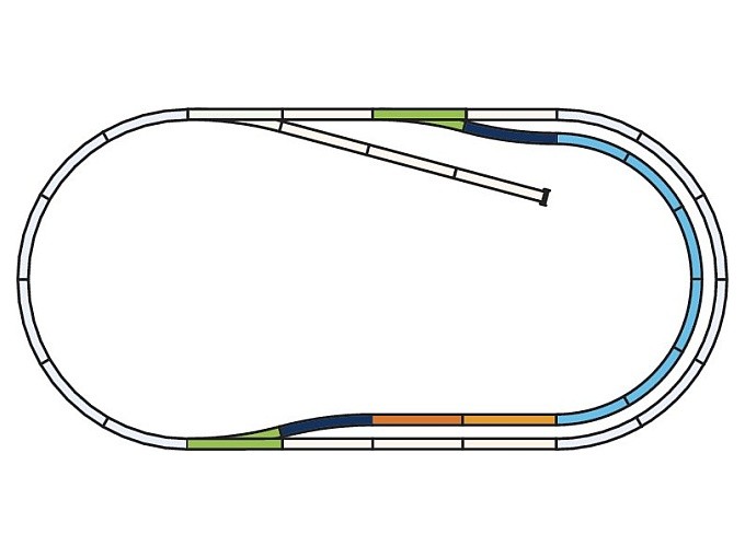 Set obsahuje pouze tmavě zvýroazněné koleje. Kompletního oválu lze dosáhnout kombinací setů A + B + C