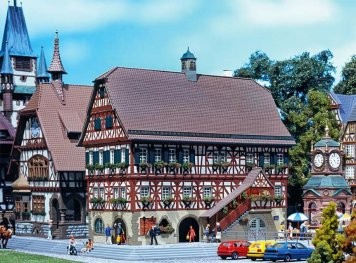 Stavebnice modelu třípatrového hrázděného domu se strmou valbovou střechou.