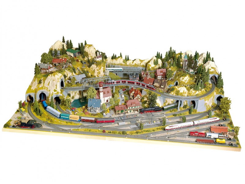 Hotový základ kolejiště a krajiny "Luzern" ručně malovaný a zatravněný. Kolejiště dále obsahuje, mosty, tunely, naznačenou stopu pro kolejivo, dále kolejové plány.