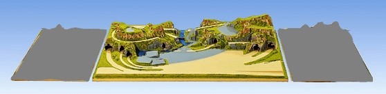 Hotový výlisek krajinky "Baden-Baden"která je připravená na trať vedoucí tunely k léčebnému městečku kde je nádraží s pěti průběžnými kolejemi a dvěma nástupišti. Trať vede kolem řeky.Řeka je připravená pro vodu a umístění čerpadla.Krajinka je zatravněná a ručně malovaná,která je v základním dřevěném rámu.Součástí krajinky jsou vestavěné tunely s malovanými portály a plány instalace kolejí pro systém   Arnold