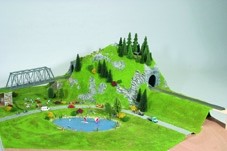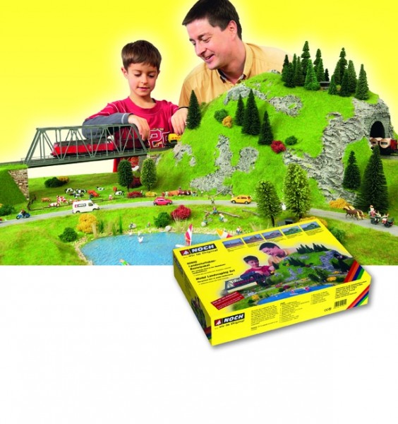 Základem setu je osvědčený NOCH TERRA-FORM systém -  krep pro tvorbu krajiny.Dále set obsahuje skály,2 tunelové portály,travní posypy,lepidlo na travní posypy,kamení,most,jezerní fólii,silniční fólii,fólii- zeď,dekorační mech,10 modelů stromů.