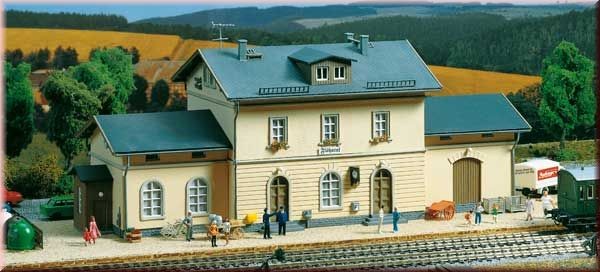 Malá typická nádražní hala se skladištěm, odděleným vchodem do restaurace, historickými nádražními hodinami apod. Podle nádraží Gelobtland na trati Flöha-Marienberg-Reitzenhain v Sasku. Model podle skutečnosti.