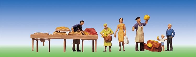 Na trhu.Postavičky a doplňky hodící se na trh, prodejci,kupující.