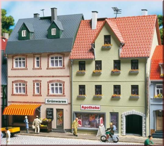 Obytné domy i budovy s prodejními prostory v moderním stylu. V domě č. 5 nalezneme zelinářství, markýzu, regály na zeleninu, tabuli s nabídkou a dřevěné zastřešené venkovní posezení na zadní straně budovy, vstup do dvora domu č. 7 ukrývá lékárnu, stojan na jízdní kola, ozdobný štít na nároží. Za budovami se nachází balkony a vstupy do dvora. Přiloženy jsou rovněž antény, podpěry k pověšení prádla, hranice dříví a květinový dekorační materiál.