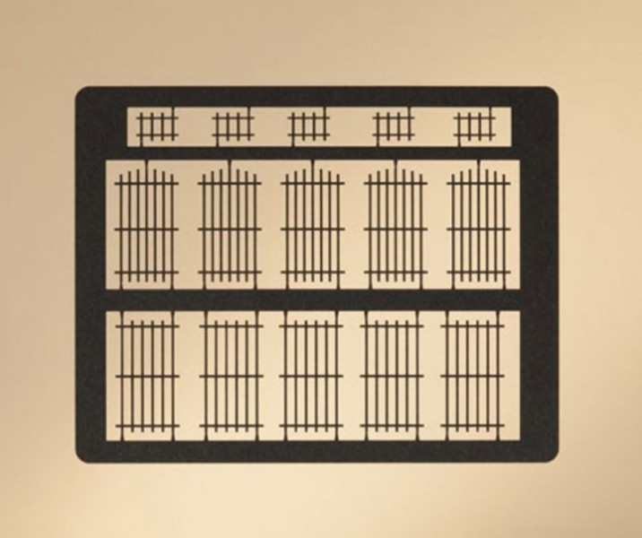Detailně propracované mříže jsou vyřezány laserem z pevného kartonu. Tyto rovné mříže jsou vhodné i pro náš model kat. č. 11 424 Správní budova.
