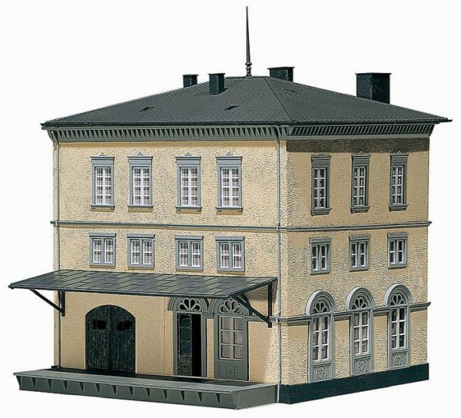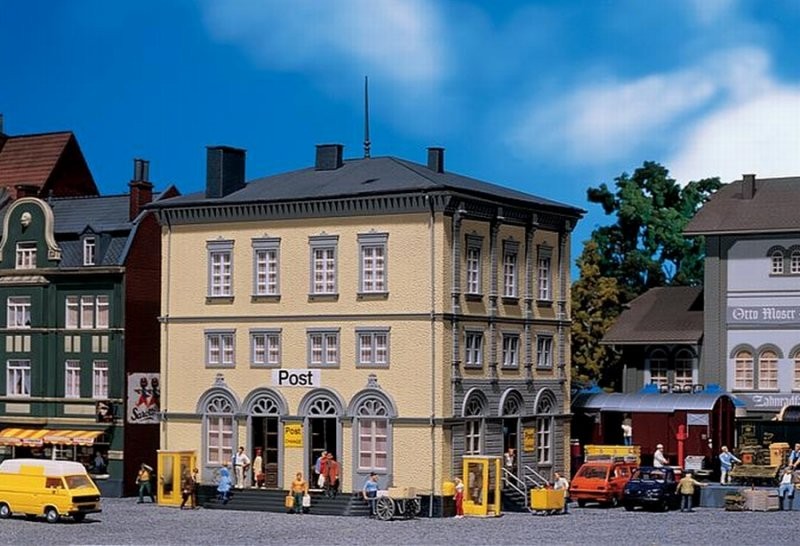 Stavebnice modelu pošty s širokým vstupním schodištěm a zadní nákladní rampou.