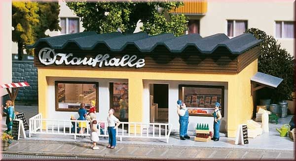 Tato prodejna s bočním zastřešením, např. k umístění popelnic, byla postavena v sedmdesátých letech. K sadě je přiloženo vnitřní vybavení jako police, pult, pokladna nebo zábradlí a jízdní kolo. Zařízení vynikne obzvlášť po osvětlení.