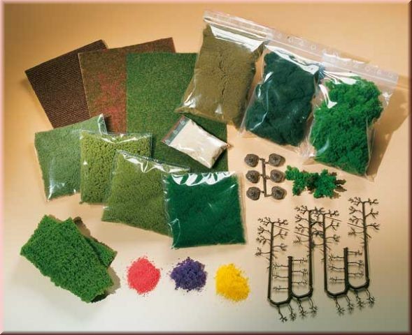 Sestavili jsme pro vás výběr těch nejoblíbenějších materiálů k tvorbě krajiny, které si zde můžete vyzkoušet v menších množstvích. Všechny položky jsou k dostání také samostatně. Sada obsahuje: 3 plastové sáčky s jemnými dekorativními pěnovými vločkami v růžové, fialové a žluté barvě k tvorbě květin, Brambořiště s úzkými brázdami 16 x 22 cm, Koberec se strukturou vřesoviště 25 x 17 cm, Koberec se strukturou louky světlý 25 x 17 cm, Jemná pěnová hmota tmavě zelené barvy 500 ml, Středně hrubá pěnová hmota světle zelené barvy 500 ml, Jemné pěnové vločky olivově zelené 400 ml, Jemné pěnové vločky světle zelené barvy 100 ml, Jemné pěnové vločky v barvě listové zeleně 100 ml, Jemné pěnové vločky v barvě jarní zeleně 100 ml, Středně hrubé pěnové vločky v barvě jarní zeleně 100 ml, Písek ca 60 g, Travnatý koberec světle zelené barvy 15 x 12 cm, 4 kmeny borovice, 2 keře.
