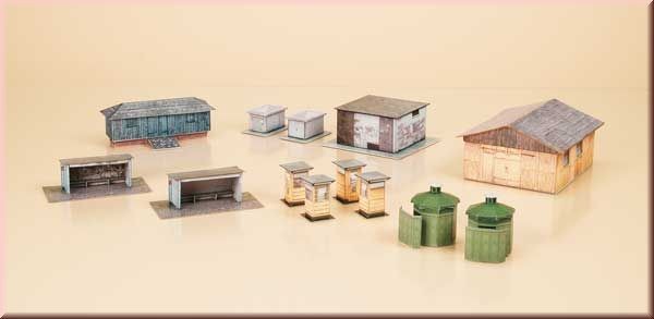 Plechová kůlna 100 x 80 x 52 mm, Telefonní budka 20 x 20 x 30 mm, Pánské toalety 35 x 35 x 38 mm, Stavební buňka 92 x 26 x 26 mm, Trafostanice 30 x 45 x 20 mm, Čerpací stanice 83 x 80 x 36 mm, 2 čekárny 80 x 40 x 28 mm