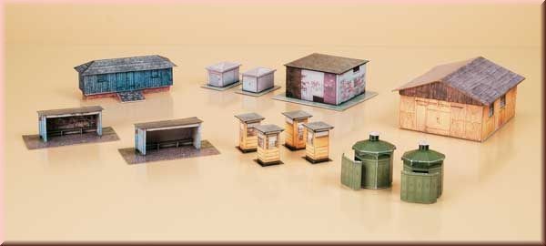 Plechová kůlna 73 x 58 x 38 mm, Telefonní budka 15 x 15 x 22 mm, Pánské toalety 25 x 25 x 28 mm, Stavební buňka 67 x 20 x 20 mm, Trafostanice 22 x 33 x 15 mm, Čerpací stanice 83 x 80 x 36 mm, 2 čekárny s rozměry vždy je 58 x 29 x 20 mm