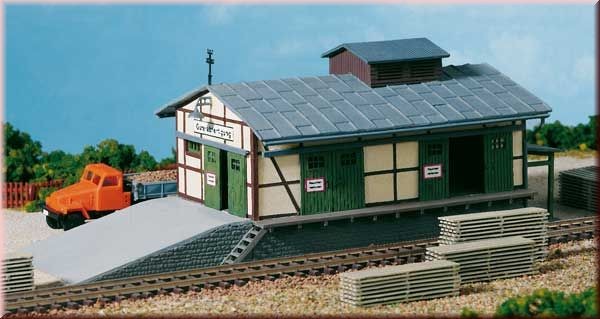 Hrázděná budova s plechovou střechou, k níž náleží nájezdová rampa a rampy na straně silnice a kolejí. Všechna vrata jsou pohyblivá. Jednotlivé díly jsou sestaveny tak, aby bylo možné vytvořit ze dvou stavebnic velké nákladové nádraží či skladištní halu.