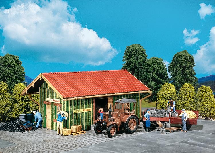 Sklad s posuvnými dveřmi, traktor s přívěsem, pytle s uhlím, figurka obchodníka a další doplňky.