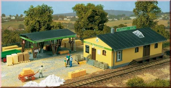 Malé budovy s obchodními a skladovacími prostory k vytvoření vesnické scenérie, nakládacími rampami sloužícími jako napojení na koleje a zastřešenou volnou plochou. Jedná se o typickou účelovou stavbu, kterou lze nalézt ve středním Německu. S touto stavebnicí můžete vytvořit také Zemědělské obchodní družstvo, typické pro bývalou NDR. Příslušné tiskoviny jsou přiloženy.