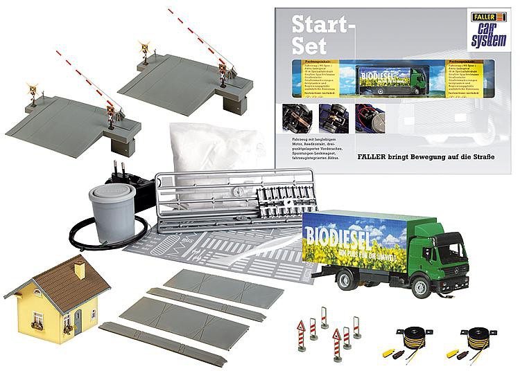 H0 Car System - startovní set s nákladním automobilem Mercedes-Benz SK, železničním přejezdem FA120171, nabíječkou akumulátorů, 10 m vodícího drátu, tmelem a barvou na tvorbu silnice, silničním značením a svodidly.