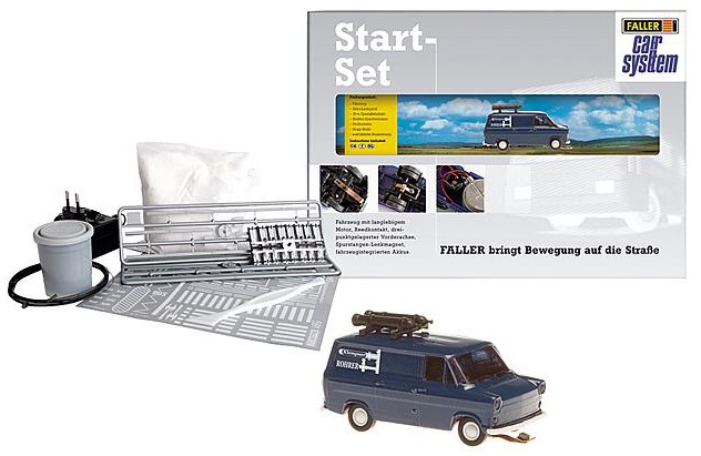 H0 Car System - startovní set s automobilem Ford Transit, nabíječkou akumulátorů, 10 m vodícího drátu, tmelem a barvou na tvorbu silnice, silničním značením a svodidly.