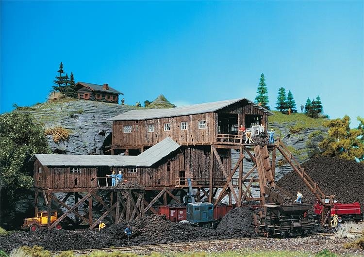 Stavebnice modelu uhelného dolu v dřevěné konstrukci s různým příslušenstvím.