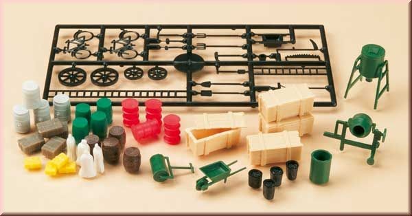 Dřevěné bedny s víky, pytle mouky, nádrž pro uskladnění sypkého materiálu, drobné pracovní nářadí a jiné.