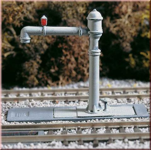 Vodní jeřáb s odtokovou mříží a otočným ramenem. Vodní jeřáby k doplňování vody stávaly nejen v areálech železničních dep, ale také v kolejišti průjezdných nádražích.