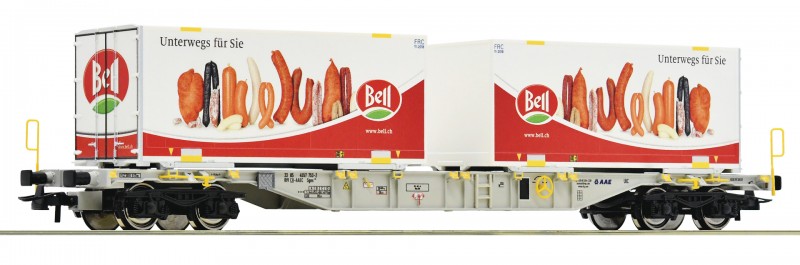 Kontejnerový vůz, typ Sgns, Ahaus Alstätter Eisenbahn (AAE).■ Naloženo dvěma výměnnými nástavbami společnosti Bell