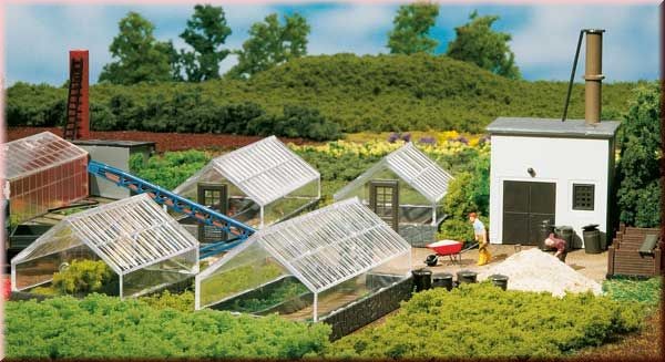 2 malé skleníky s rozměry vždy 53 x 40 x 34 mm, 2 velké skleníky s rozměry vždy 77 x 40 x 34 mm, Výtopna s rozměry 49 x 34 x 83 mm